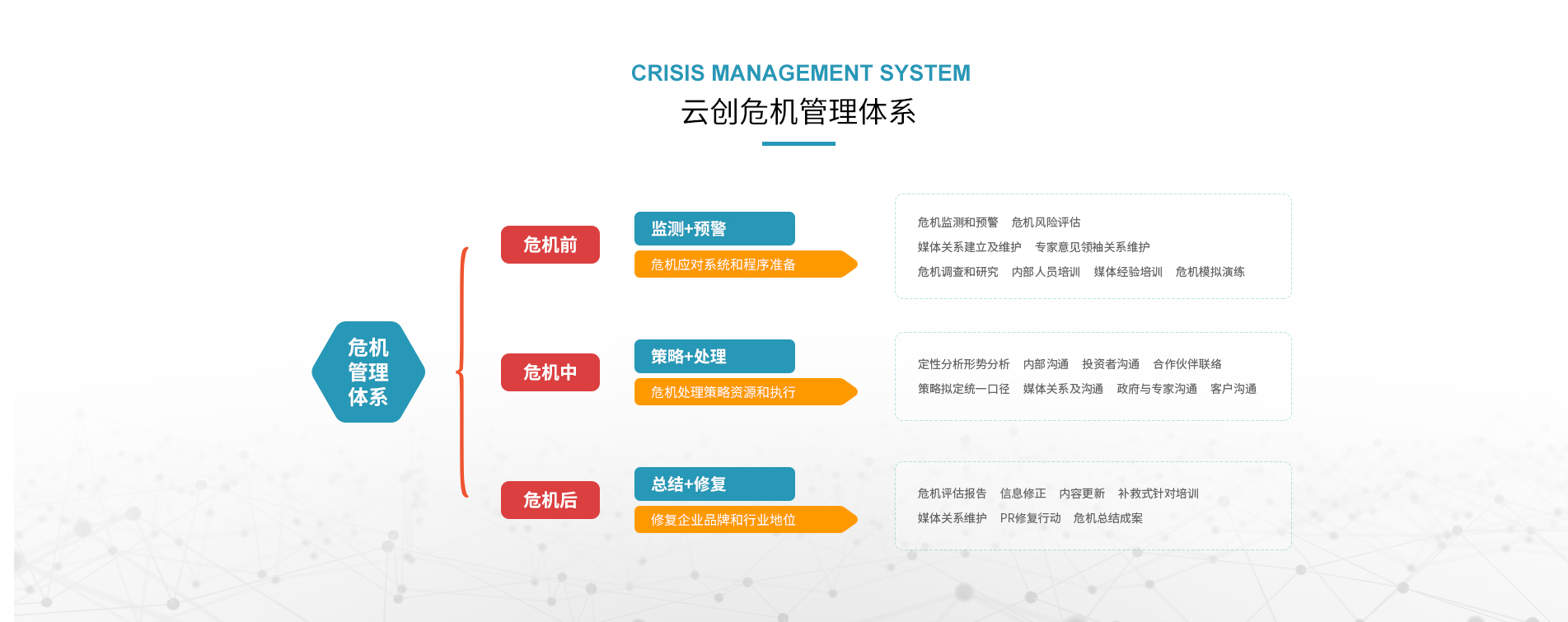 1小時(shí)內(nèi)危機(jī)預(yù)警,黃金4小時(shí)危機(jī)處理、PR修復(fù)行動(dòng)、危機(jī)評(píng)估報(bào)告